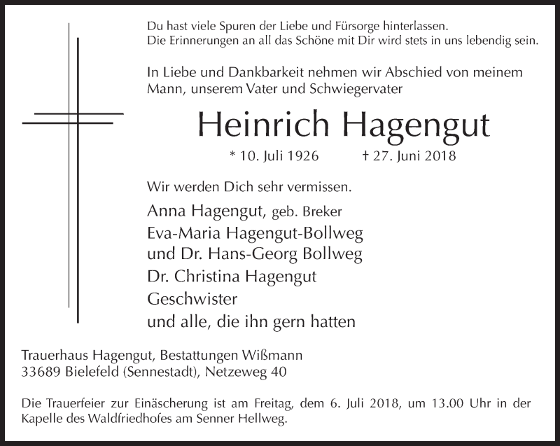 Hier finden Sie alle Traueranzeigen aus der Zeitung, die bisher für Heinrich Hagengut erschienen sind. Weitere Traueranzeigen, die in der Zeitung erscheinen, werden hier ebenfalls aufgelistet