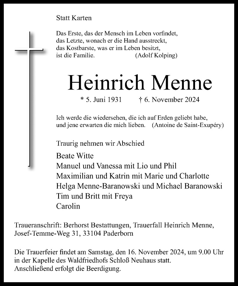 Hier finden Sie alle Traueranzeigen aus der Zeitung, die bisher für Heinrich Menne erschienen sind. Weitere Traueranzeigen, die in der Zeitung erscheinen, werden hier ebenfalls aufgelistet