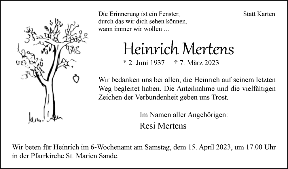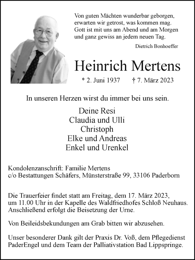 Hier finden Sie alle Traueranzeigen aus der Zeitung, die bisher für Heinrich Mertens erschienen sind. Weitere Traueranzeigen, die in der Zeitung erscheinen, werden hier ebenfalls aufgelistet
