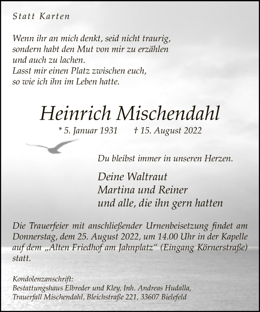 Hier finden Sie alle Traueranzeigen aus der Zeitung, die bisher für Heinrich Mischendahl erschienen sind. Weitere Traueranzeigen, die in der Zeitung erscheinen, werden hier ebenfalls aufgelistet