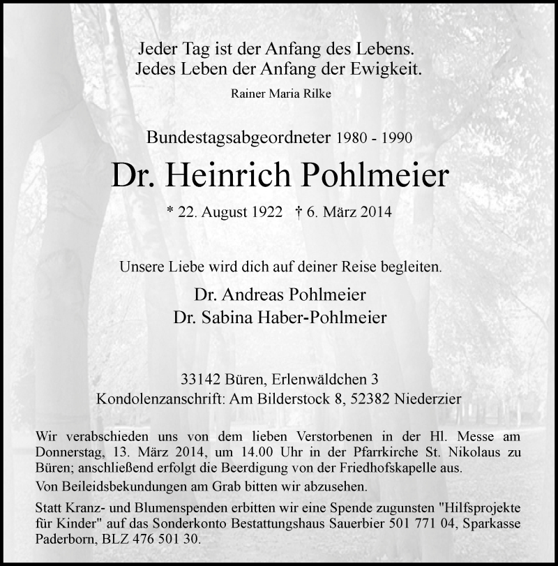 Hier finden Sie alle Traueranzeigen aus der Zeitung, die bisher für Heinrich Pohlmeier erschienen sind. Weitere Traueranzeigen, die in der Zeitung erscheinen, werden hier ebenfalls aufgelistet