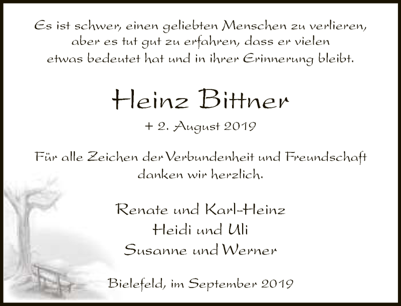 Hier finden Sie alle Traueranzeigen aus der Zeitung, die bisher für Heinz Bittner erschienen sind. Weitere Traueranzeigen, die in der Zeitung erscheinen, werden hier ebenfalls aufgelistet