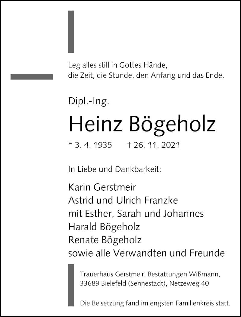 Hier finden Sie alle Traueranzeigen aus der Zeitung, die bisher für Heinz Bögeholz erschienen sind. Weitere Traueranzeigen, die in der Zeitung erscheinen, werden hier ebenfalls aufgelistet