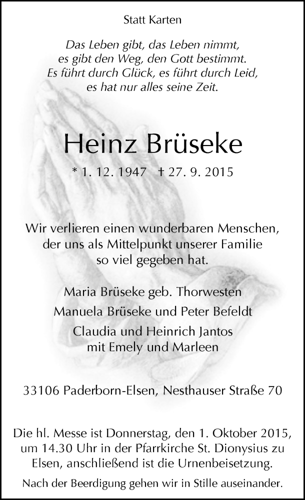 Hier finden Sie alle Traueranzeigen aus der Zeitung, die bisher für Heinz Brüseke erschienen sind. Weitere Traueranzeigen, die in der Zeitung erscheinen, werden hier ebenfalls aufgelistet