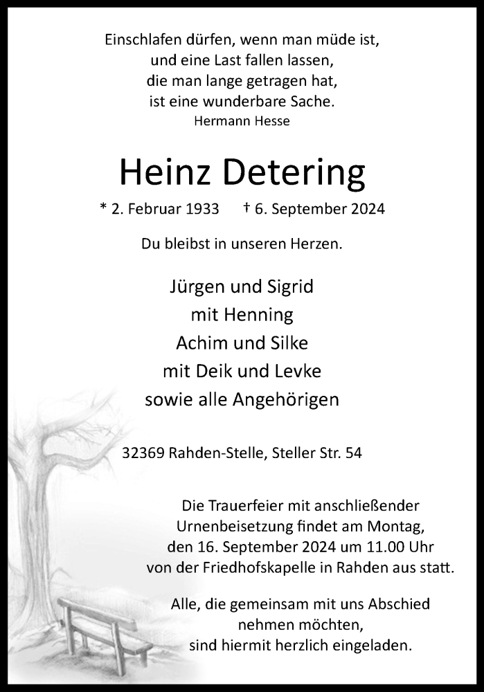 Hier finden Sie alle Traueranzeigen aus der Zeitung, die bisher für Heinz Detering erschienen sind. Weitere Traueranzeigen, die in der Zeitung erscheinen, werden hier ebenfalls aufgelistet