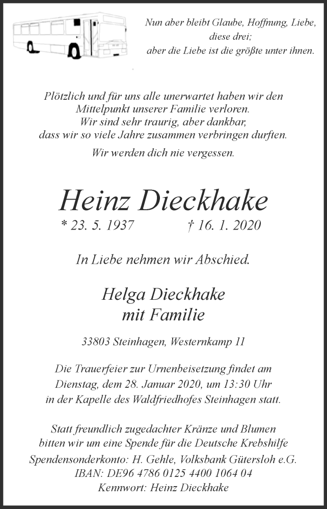 Hier finden Sie alle Traueranzeigen aus der Zeitung, die bisher für Heinz Dieckhake erschienen sind. Weitere Traueranzeigen, die in der Zeitung erscheinen, werden hier ebenfalls aufgelistet