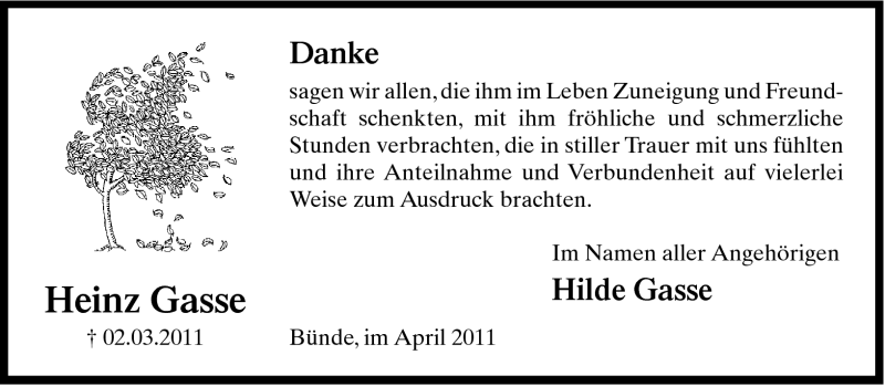 Hier finden Sie alle Traueranzeigen aus der Zeitung, die bisher für Heinz Gasse erschienen sind. Weitere Traueranzeigen, die in der Zeitung erscheinen, werden hier ebenfalls aufgelistet