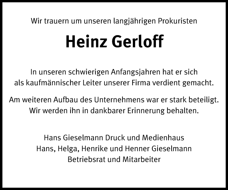 Hier finden Sie alle Traueranzeigen aus der Zeitung, die bisher für Heinz Gerloff erschienen sind. Weitere Traueranzeigen, die in der Zeitung erscheinen, werden hier ebenfalls aufgelistet