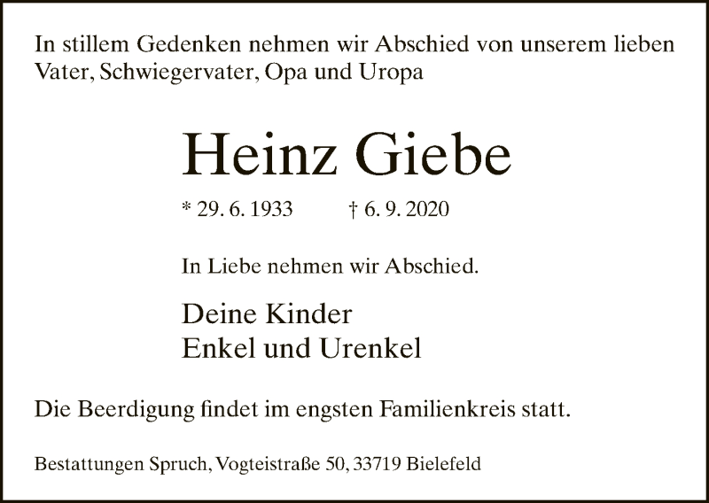 Hier finden Sie alle Traueranzeigen aus der Zeitung, die bisher für Heinz Giebe erschienen sind. Weitere Traueranzeigen, die in der Zeitung erscheinen, werden hier ebenfalls aufgelistet