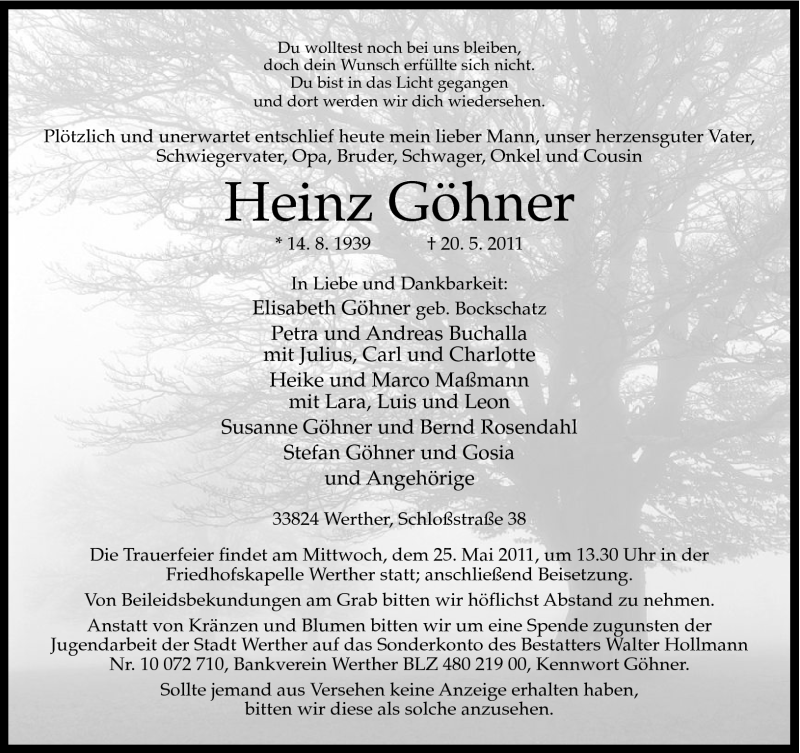 Hier finden Sie alle Traueranzeigen aus der Zeitung, die bisher für Heinz Göhner erschienen sind. Weitere Traueranzeigen, die in der Zeitung erscheinen, werden hier ebenfalls aufgelistet