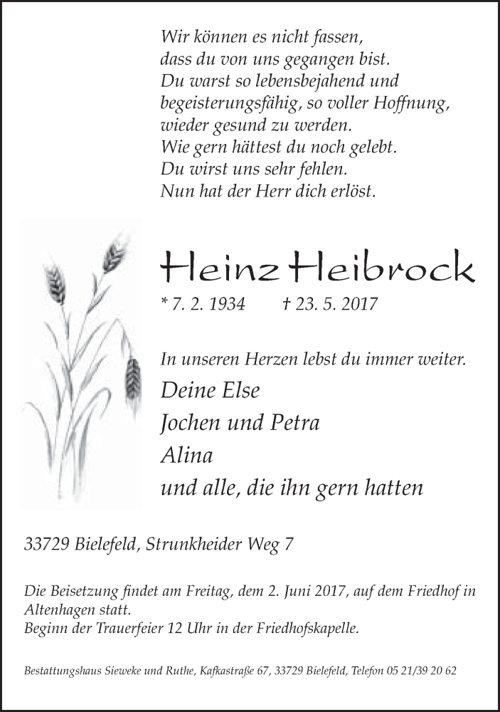 Hier finden Sie alle Traueranzeigen aus der Zeitung, die bisher für Heinz Heibrock erschienen sind. Weitere Traueranzeigen, die in der Zeitung erscheinen, werden hier ebenfalls aufgelistet