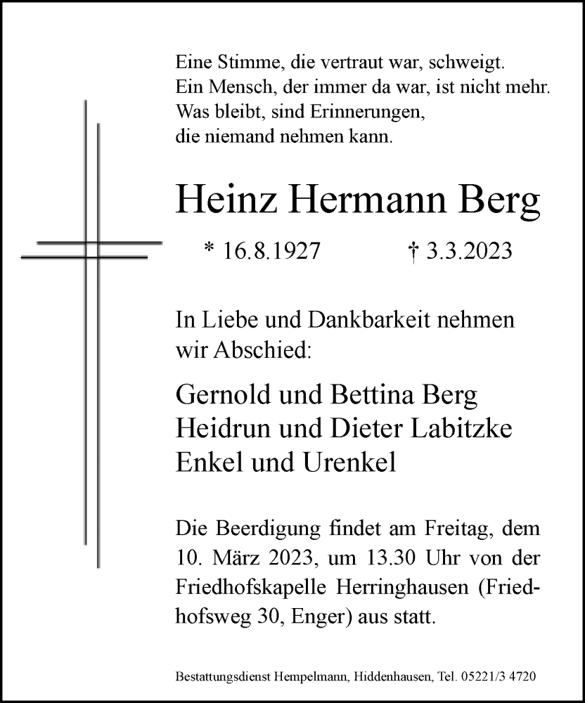 Hier finden Sie alle Traueranzeigen aus der Zeitung, die bisher für Heinz Hermann Berg erschienen sind. Weitere Traueranzeigen, die in der Zeitung erscheinen, werden hier ebenfalls aufgelistet