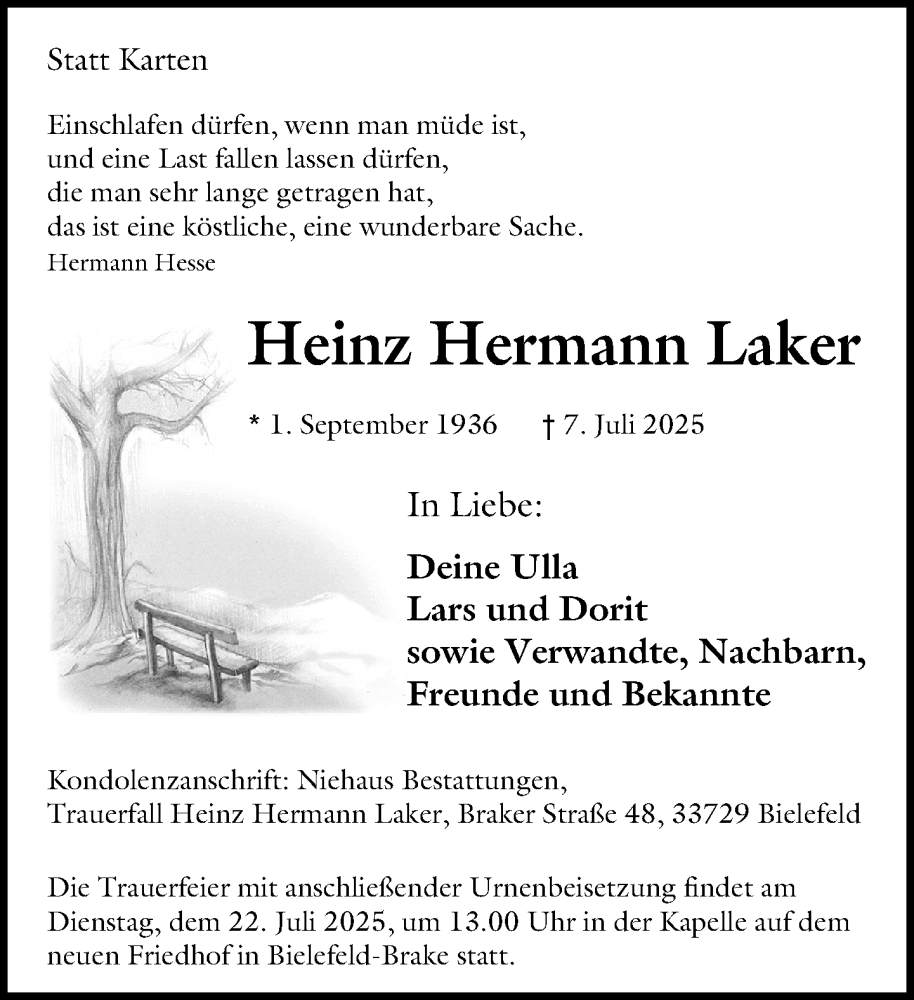 Hier finden Sie alle Traueranzeigen aus der Zeitung, die bisher für Heinz Hermann Laker erschienen sind. Weitere Traueranzeigen, die in der Zeitung erscheinen, werden hier ebenfalls aufgelistet