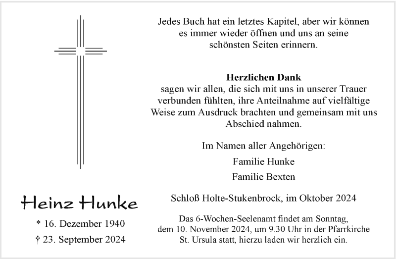 Hier finden Sie alle Traueranzeigen aus der Zeitung, die bisher für Heinz Hunke erschienen sind. Weitere Traueranzeigen, die in der Zeitung erscheinen, werden hier ebenfalls aufgelistet