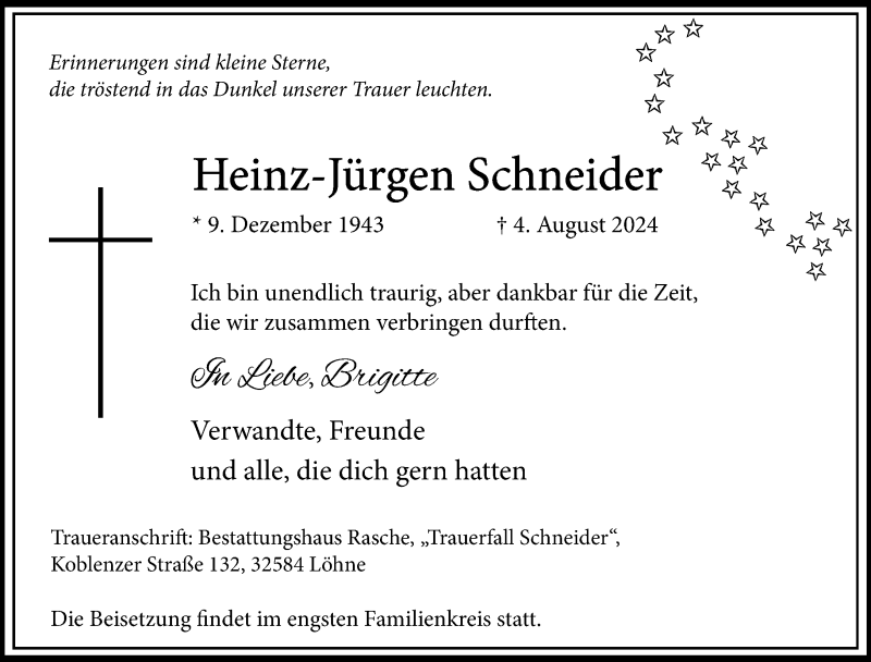 Hier finden Sie alle Traueranzeigen aus der Zeitung, die bisher für Heinz-Jürgen Schneider erschienen sind. Weitere Traueranzeigen, die in der Zeitung erscheinen, werden hier ebenfalls aufgelistet