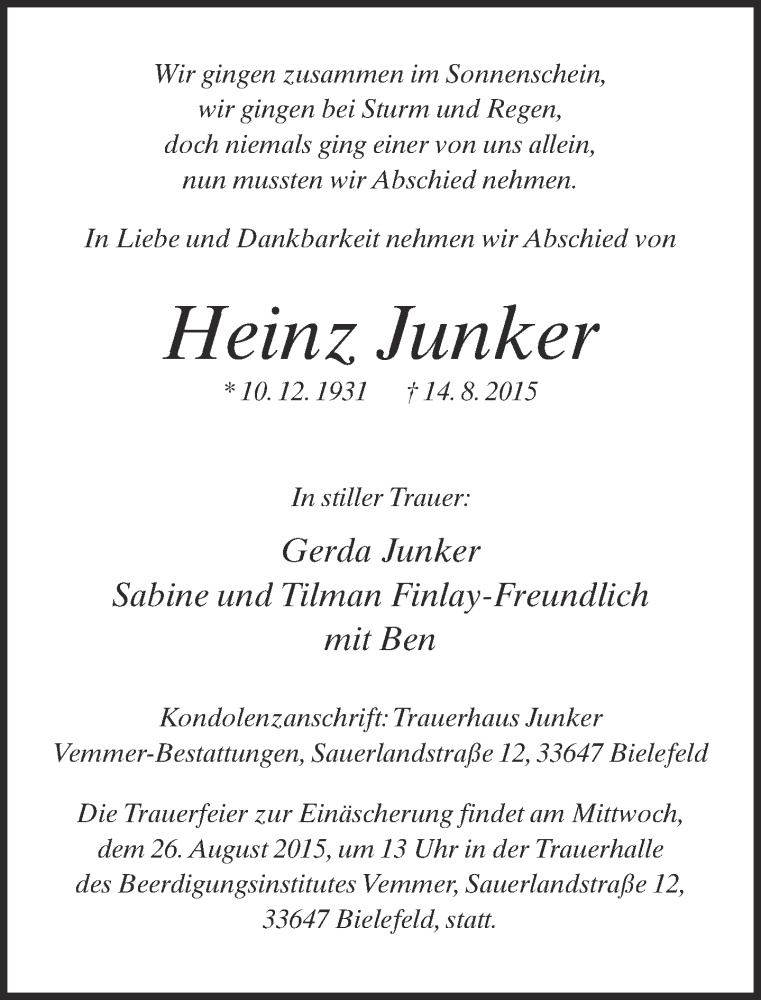 Hier finden Sie alle Traueranzeigen aus der Zeitung, die bisher für Heinz Junker erschienen sind. Weitere Traueranzeigen, die in der Zeitung erscheinen, werden hier ebenfalls aufgelistet