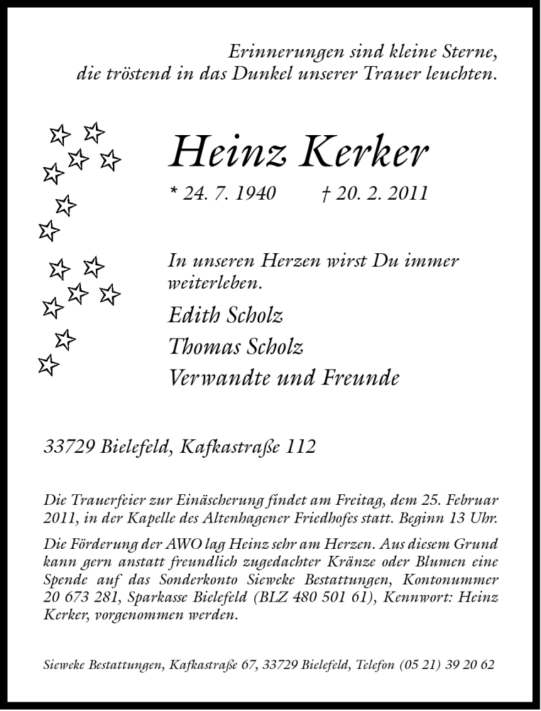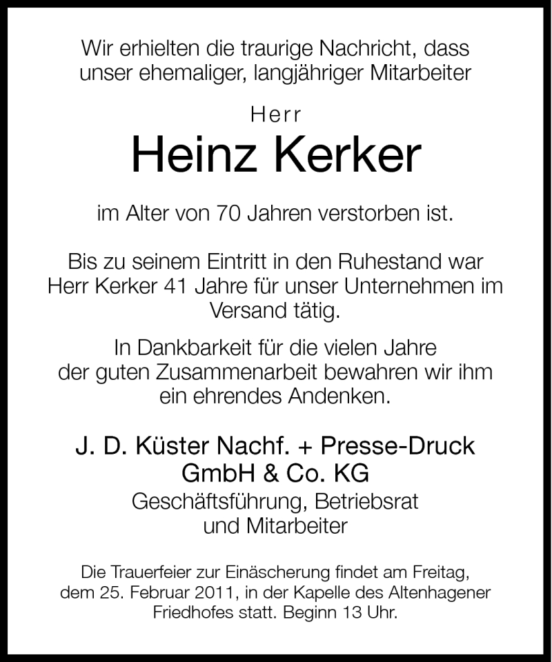 Hier finden Sie alle Traueranzeigen aus der Zeitung, die bisher für Heinz Kerker erschienen sind. Weitere Traueranzeigen, die in der Zeitung erscheinen, werden hier ebenfalls aufgelistet
