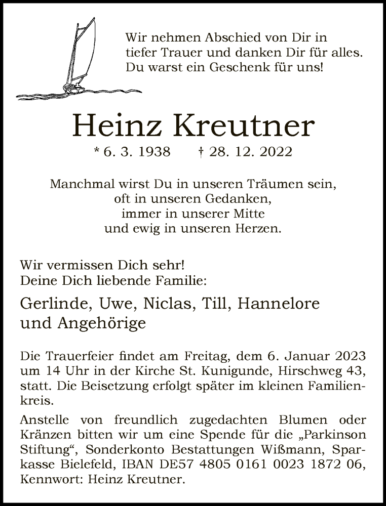 Hier finden Sie alle Traueranzeigen aus der Zeitung, die bisher für Heinz Kreutner erschienen sind. Weitere Traueranzeigen, die in der Zeitung erscheinen, werden hier ebenfalls aufgelistet