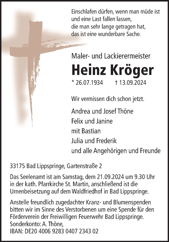 Hier finden Sie alle Traueranzeigen aus der Zeitung, die bisher für Heinz Kröger erschienen sind. Weitere Traueranzeigen, die in der Zeitung erscheinen, werden hier ebenfalls aufgelistet