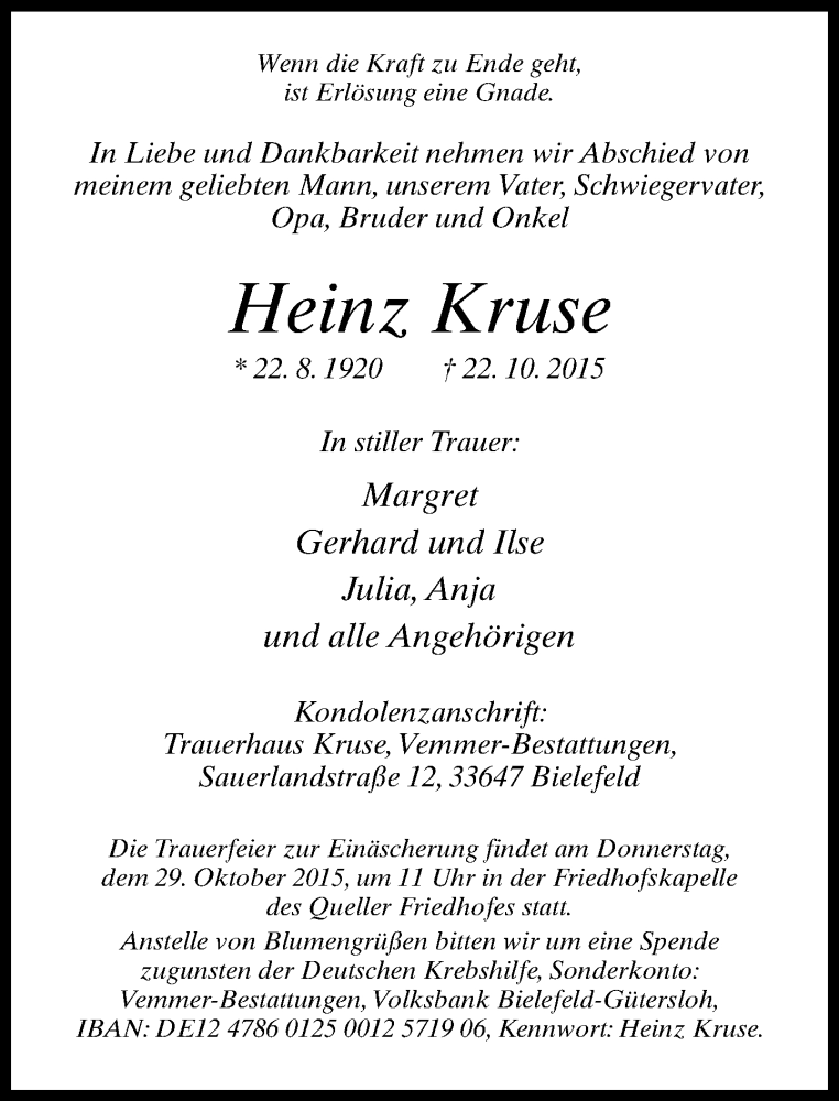 Hier finden Sie alle Traueranzeigen aus der Zeitung, die bisher für Heinz Kruse erschienen sind. Weitere Traueranzeigen, die in der Zeitung erscheinen, werden hier ebenfalls aufgelistet