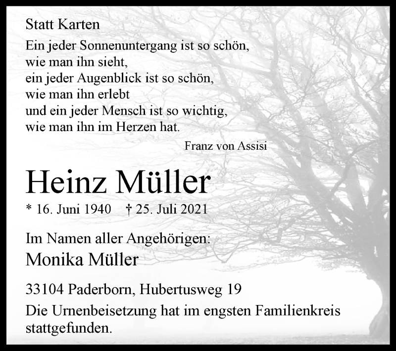 Hier finden Sie alle Traueranzeigen aus der Zeitung, die bisher für Heinz Müller erschienen sind. Weitere Traueranzeigen, die in der Zeitung erscheinen, werden hier ebenfalls aufgelistet