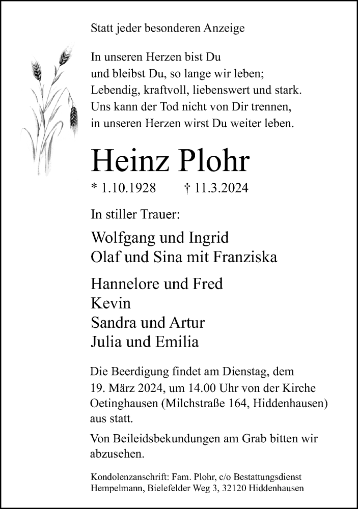 Hier finden Sie alle Traueranzeigen aus der Zeitung, die bisher für Heinz Plohr erschienen sind. Weitere Traueranzeigen, die in der Zeitung erscheinen, werden hier ebenfalls aufgelistet
