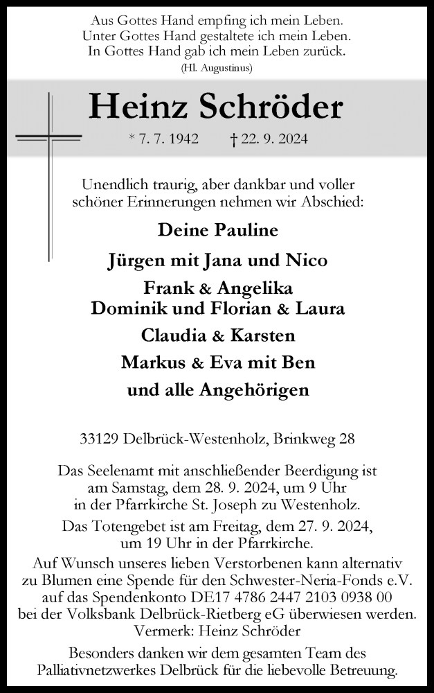 Hier finden Sie alle Traueranzeigen aus der Zeitung, die bisher für Heinz Schröder erschienen sind. Weitere Traueranzeigen, die in der Zeitung erscheinen, werden hier ebenfalls aufgelistet