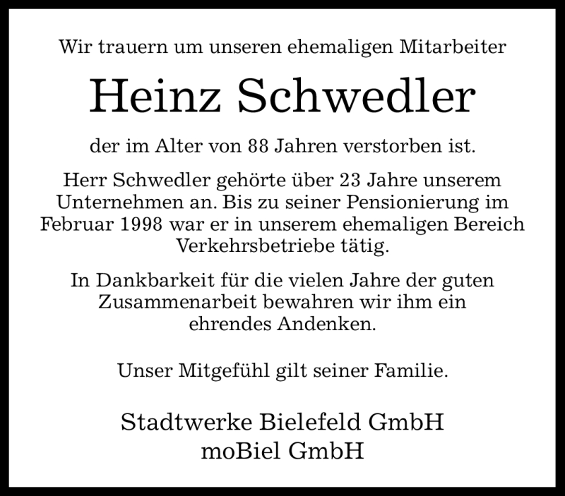 Hier finden Sie alle Traueranzeigen aus der Zeitung, die bisher für Heinz Schwedler erschienen sind. Weitere Traueranzeigen, die in der Zeitung erscheinen, werden hier ebenfalls aufgelistet