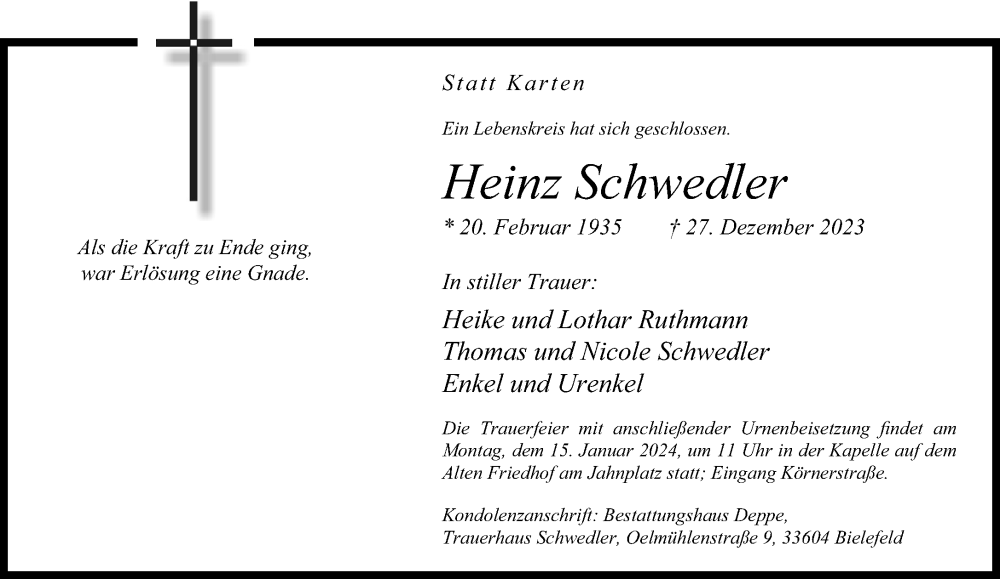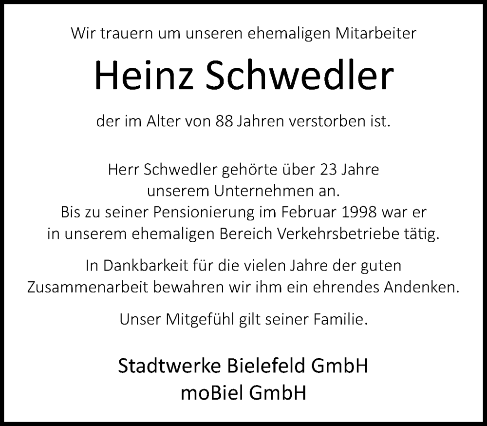 Hier finden Sie alle Traueranzeigen aus der Zeitung, die bisher für Heinz Schwedler erschienen sind. Weitere Traueranzeigen, die in der Zeitung erscheinen, werden hier ebenfalls aufgelistet