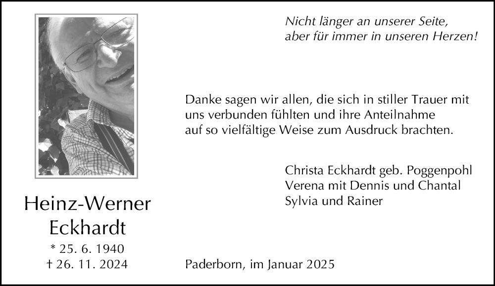 Hier finden Sie alle Traueranzeigen aus der Zeitung, die bisher für Heinz-Werner Eckhardt erschienen sind. Weitere Traueranzeigen, die in der Zeitung erscheinen, werden hier ebenfalls aufgelistet