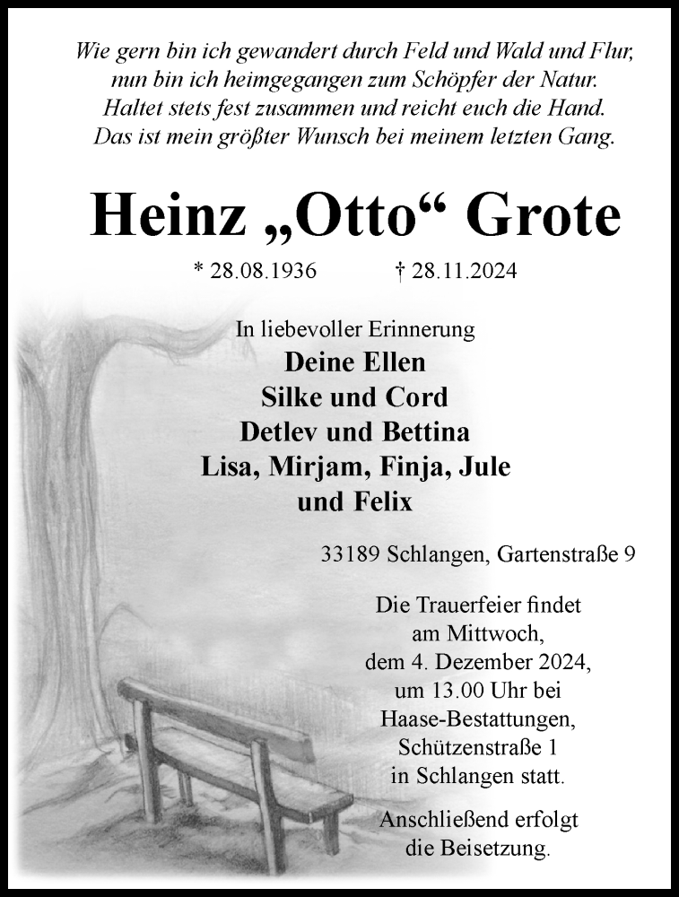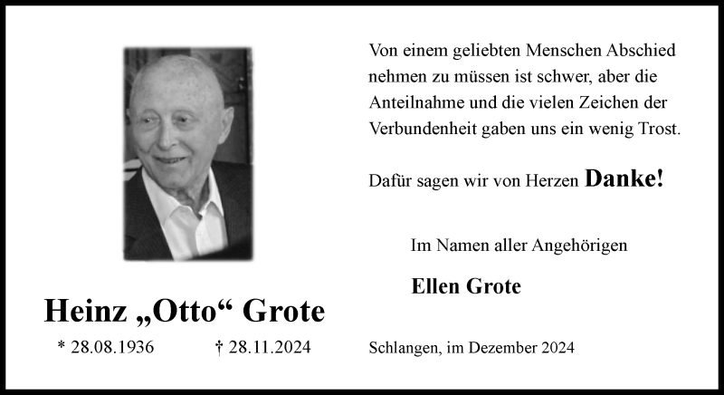 Hier finden Sie alle Traueranzeigen aus der Zeitung, die bisher für Heinz Otto Grote erschienen sind. Weitere Traueranzeigen, die in der Zeitung erscheinen, werden hier ebenfalls aufgelistet