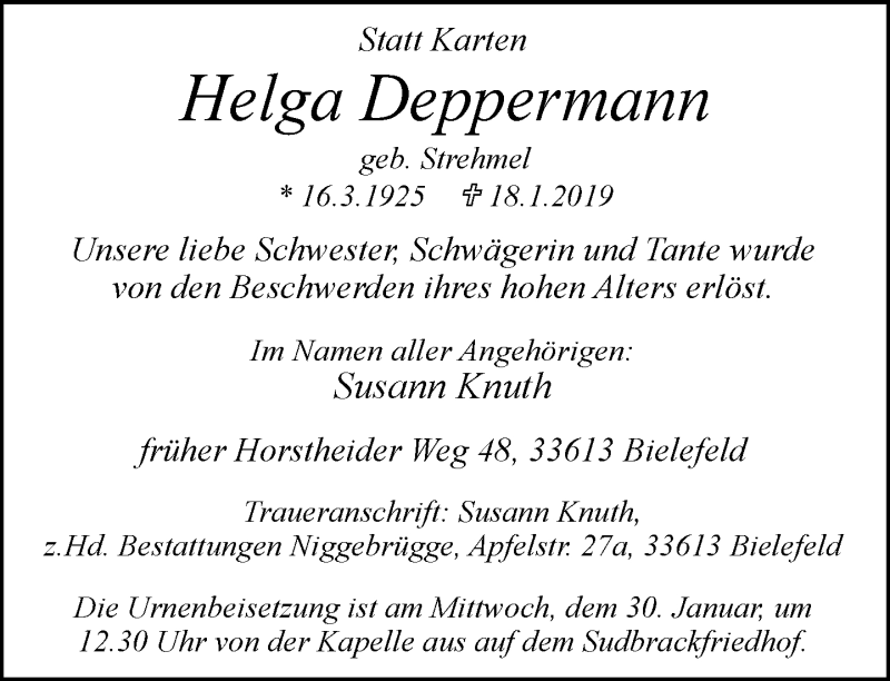 Hier finden Sie alle Traueranzeigen aus der Zeitung, die bisher für Helga Deppermann erschienen sind. Weitere Traueranzeigen, die in der Zeitung erscheinen, werden hier ebenfalls aufgelistet