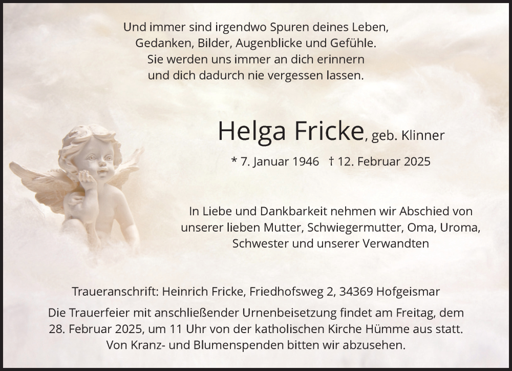 Hier finden Sie alle Traueranzeigen aus der Zeitung, die bisher für Helga Fricke erschienen sind. Weitere Traueranzeigen, die in der Zeitung erscheinen, werden hier ebenfalls aufgelistet