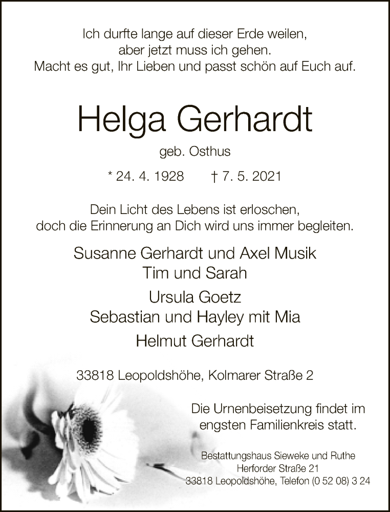Hier finden Sie alle Traueranzeigen aus der Zeitung, die bisher für Helga Gerhardt erschienen sind. Weitere Traueranzeigen, die in der Zeitung erscheinen, werden hier ebenfalls aufgelistet