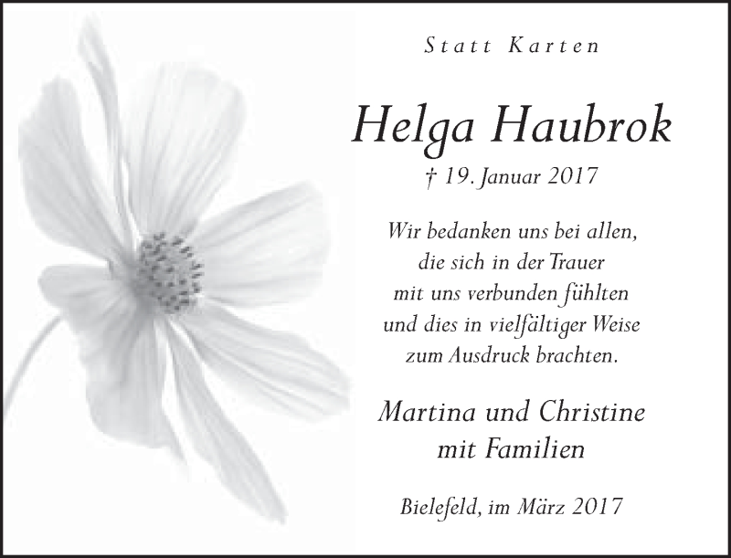 Hier finden Sie alle Traueranzeigen aus der Zeitung, die bisher für Helga Haubrok erschienen sind. Weitere Traueranzeigen, die in der Zeitung erscheinen, werden hier ebenfalls aufgelistet