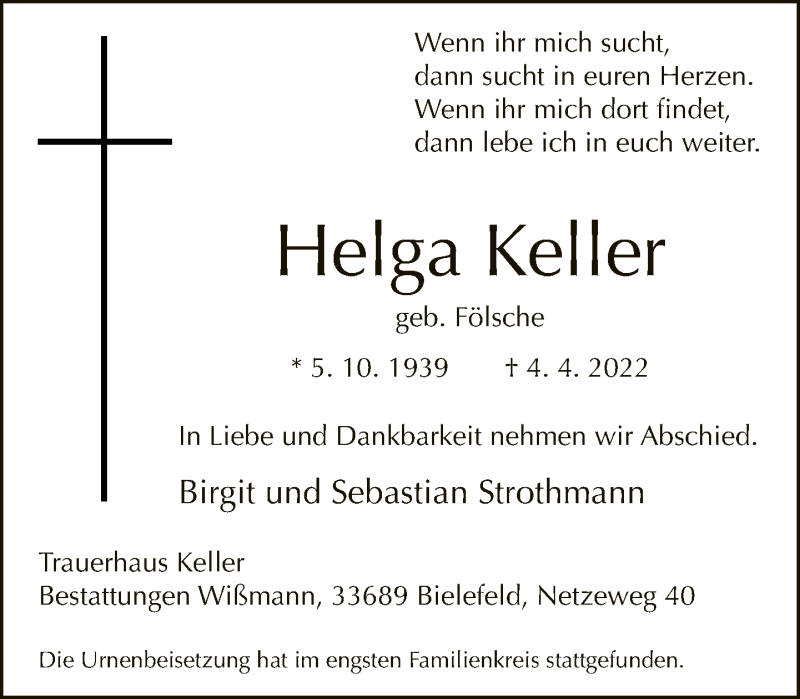 Hier finden Sie alle Traueranzeigen aus der Zeitung, die bisher für Helga Keller erschienen sind. Weitere Traueranzeigen, die in der Zeitung erscheinen, werden hier ebenfalls aufgelistet
