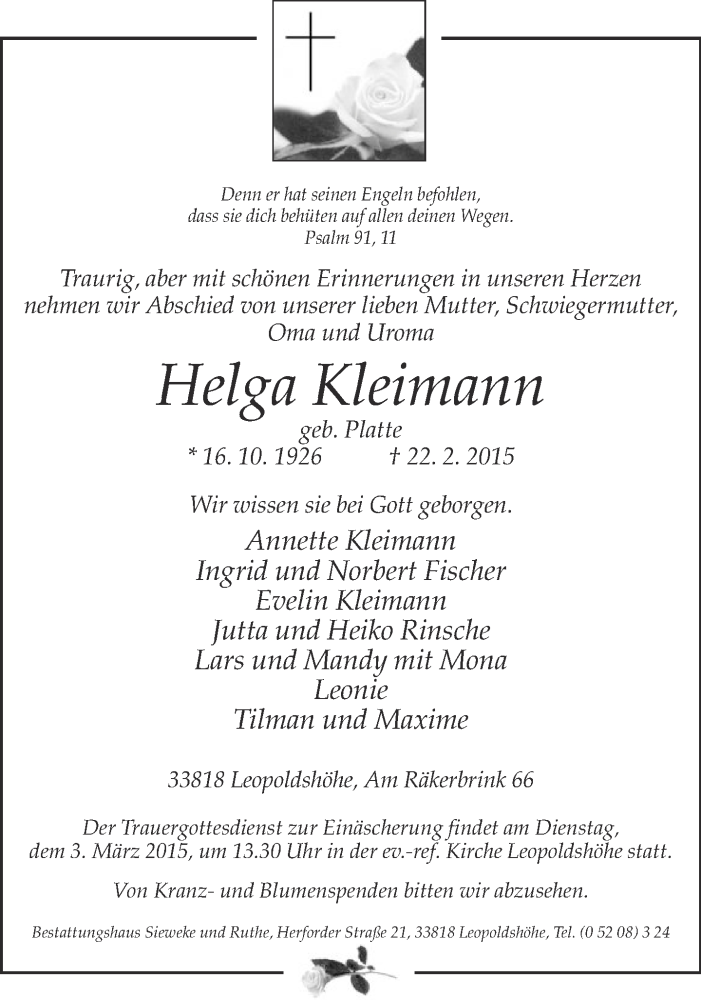Hier finden Sie alle Traueranzeigen aus der Zeitung, die bisher für Helga Kleimann erschienen sind. Weitere Traueranzeigen, die in der Zeitung erscheinen, werden hier ebenfalls aufgelistet