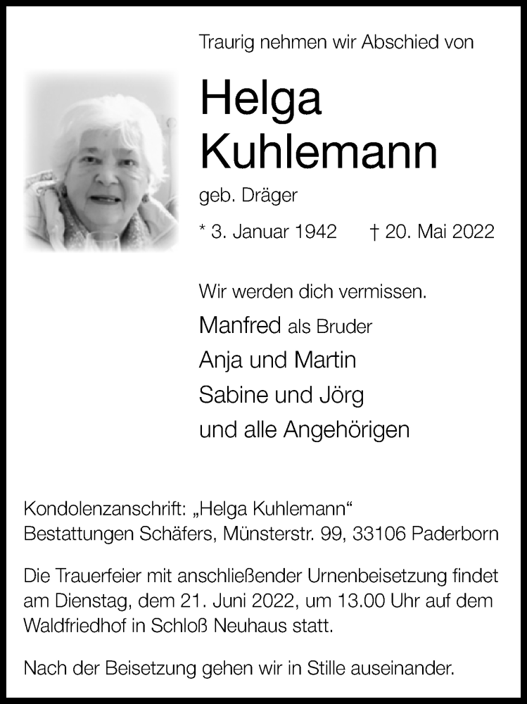 Hier finden Sie alle Traueranzeigen aus der Zeitung, die bisher für Helga Kuhlemann erschienen sind. Weitere Traueranzeigen, die in der Zeitung erscheinen, werden hier ebenfalls aufgelistet