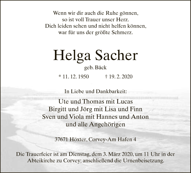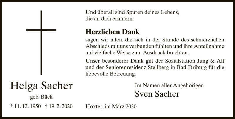 Hier finden Sie alle Traueranzeigen aus der Zeitung, die bisher für Helga Sacher erschienen sind. Weitere Traueranzeigen, die in der Zeitung erscheinen, werden hier ebenfalls aufgelistet