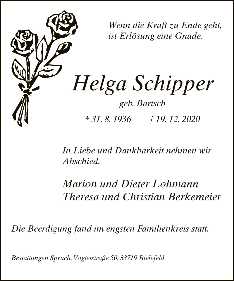 Hier finden Sie alle Traueranzeigen aus der Zeitung, die bisher für Helga Schipper erschienen sind. Weitere Traueranzeigen, die in der Zeitung erscheinen, werden hier ebenfalls aufgelistet