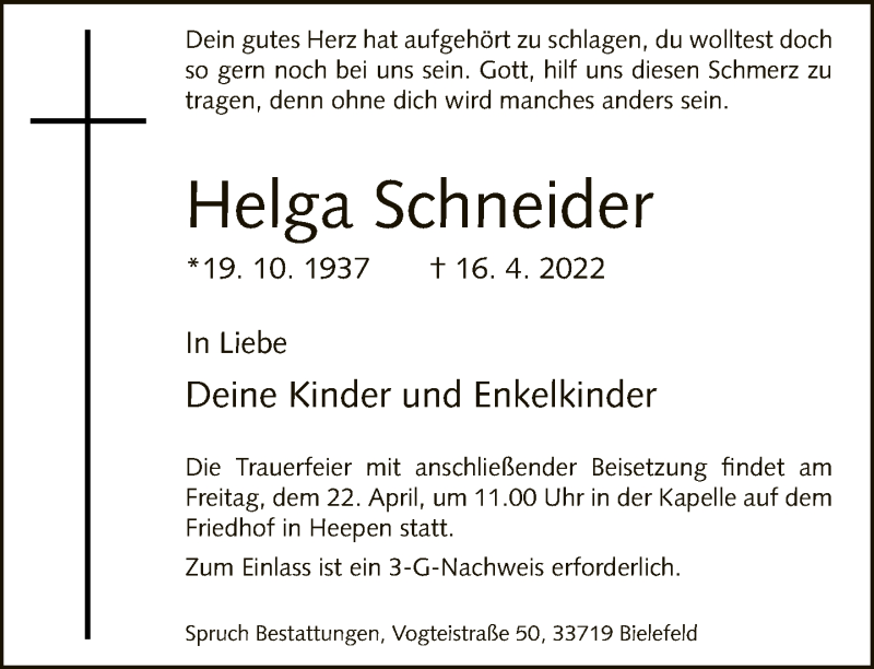 Hier finden Sie alle Traueranzeigen aus der Zeitung, die bisher für Helga Schneider erschienen sind. Weitere Traueranzeigen, die in der Zeitung erscheinen, werden hier ebenfalls aufgelistet