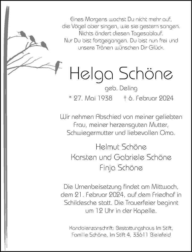 Hier finden Sie alle Traueranzeigen aus der Zeitung, die bisher für Helga Schöne erschienen sind. Weitere Traueranzeigen, die in der Zeitung erscheinen, werden hier ebenfalls aufgelistet
