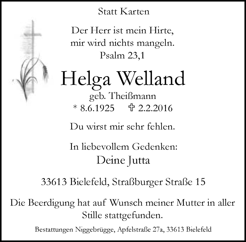 Hier finden Sie alle Traueranzeigen aus der Zeitung, die bisher für Helga Welland erschienen sind. Weitere Traueranzeigen, die in der Zeitung erscheinen, werden hier ebenfalls aufgelistet