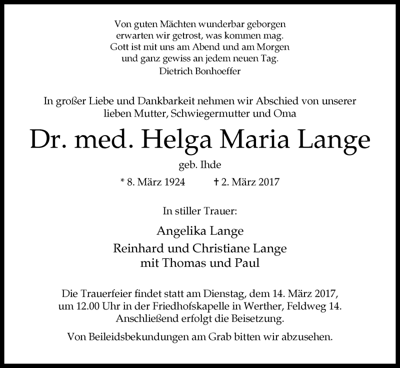 Hier finden Sie alle Traueranzeigen aus der Zeitung, die bisher für Helga Maria Lange erschienen sind. Weitere Traueranzeigen, die in der Zeitung erscheinen, werden hier ebenfalls aufgelistet