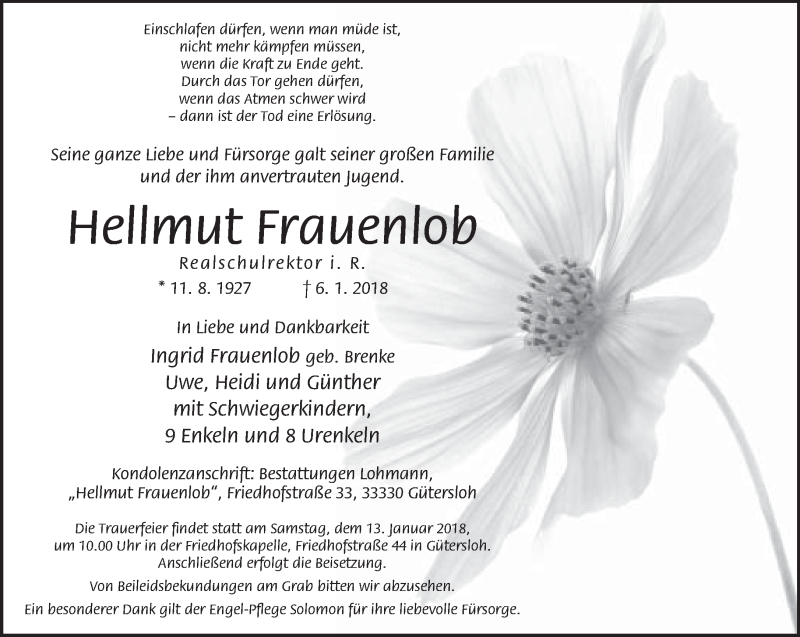 Hier finden Sie alle Traueranzeigen aus der Zeitung, die bisher für Hellmut Fratenlob erschienen sind. Weitere Traueranzeigen, die in der Zeitung erscheinen, werden hier ebenfalls aufgelistet