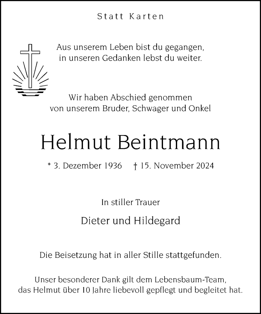 Hier finden Sie alle Traueranzeigen aus der Zeitung, die bisher für Helmut Beintmann erschienen sind. Weitere Traueranzeigen, die in der Zeitung erscheinen, werden hier ebenfalls aufgelistet