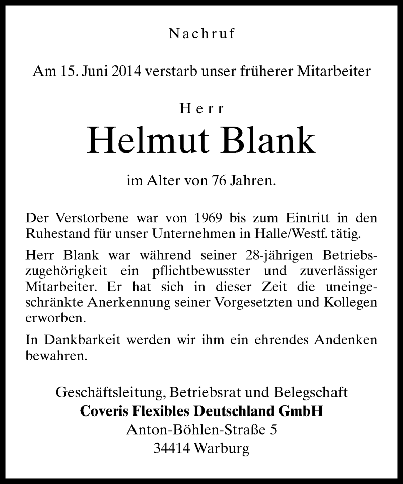 Hier finden Sie alle Traueranzeigen aus der Zeitung, die bisher für Helmut Blank erschienen sind. Weitere Traueranzeigen, die in der Zeitung erscheinen, werden hier ebenfalls aufgelistet