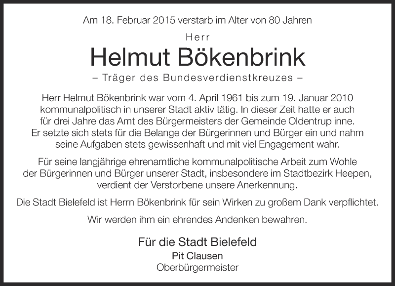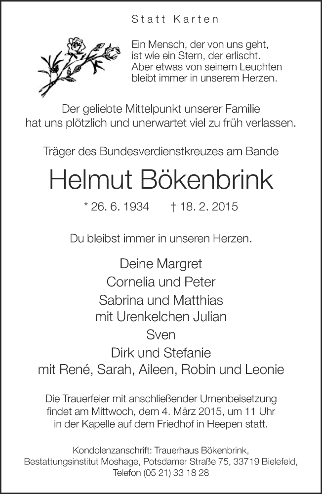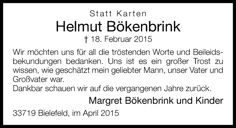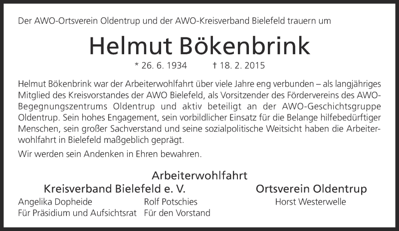 Hier finden Sie alle Traueranzeigen aus der Zeitung, die bisher für Helmut Bökenbrink erschienen sind. Weitere Traueranzeigen, die in der Zeitung erscheinen, werden hier ebenfalls aufgelistet