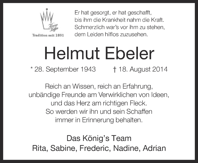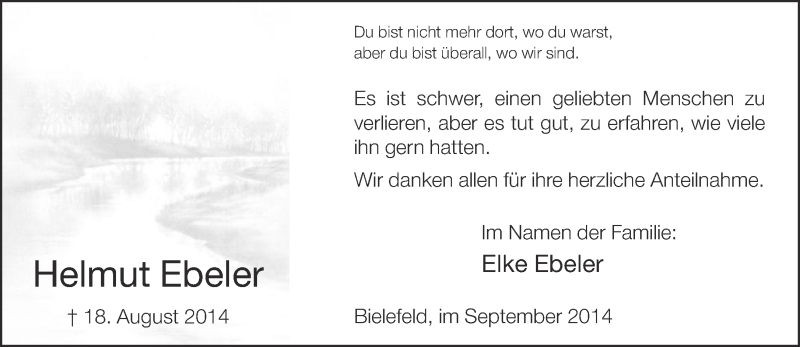 Hier finden Sie alle Traueranzeigen aus der Zeitung, die bisher für Helmut Ebeler erschienen sind. Weitere Traueranzeigen, die in der Zeitung erscheinen, werden hier ebenfalls aufgelistet