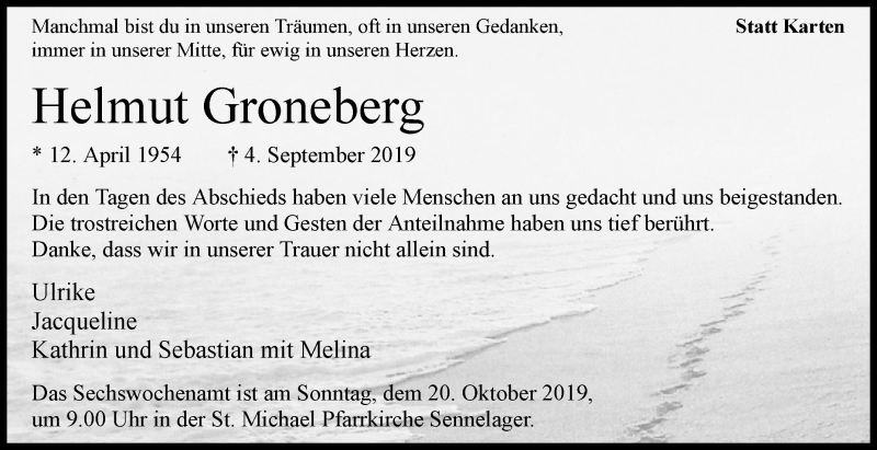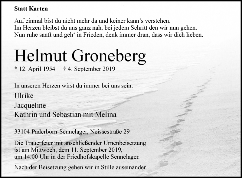 Hier finden Sie alle Traueranzeigen aus der Zeitung, die bisher für Helmut Groneberg erschienen sind. Weitere Traueranzeigen, die in der Zeitung erscheinen, werden hier ebenfalls aufgelistet